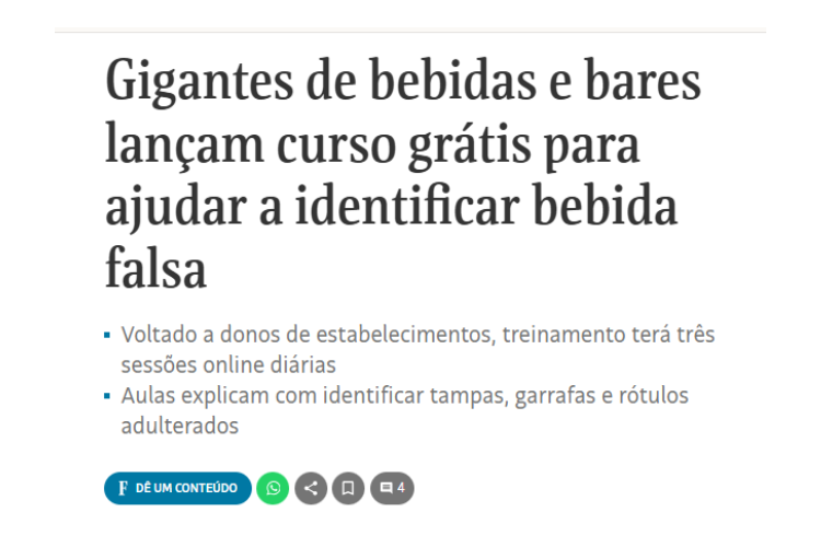 A Folha de S. Paulo destacou nesta quarta-feira (1º) o lançamento de um curso gratuito para ajudar donos de bares e restaurantes a identificar bebidas falsificadas. A iniciativa é fruto de parceria entre a Associação Brasileira de Bebidas Destiladas (ABBD), a Associação Brasileira de Bebidas (Abrabe) e a Abrasel.